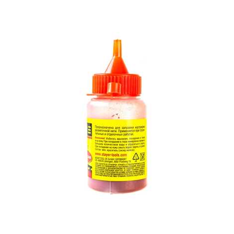 Широкое применение в ремонтных, отделочных, строительных работах находит разметочный шнур. С его помощью очень просто и легко «отбить» идеально ровную горизонтальную, диагональную, вертикальную линию. Достаточно натянуть шнур между двумя ранее поставленными отметками, слегка отвести и отпустить. В месте его соприкосновения с поверхностью останется ярко выраженный след (линия). Однако при условии интенсивного применения, красящая способность инструмента постепенно утрачивается. Получаемая разметка теряет былую четкость, становится блеклой и слабозаметной. В этом случае необходимо заправить разметочную нить, используя меловой порошок (50 г) красный STAYER .Он представляет собой специальный красящий состав, изготовленный на меловой основе.