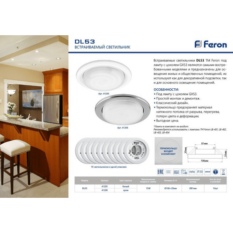 Светильник DL53 Feron типа GX53 предназначена для использования со встраиваемыми светильниками GX53, которые устанавливаются в натяжных потолках и подвесных системах. Применяется для освещения как в жилых, так и офисных помещениях, торговых залах, вестибюлях, фойе и т.д.